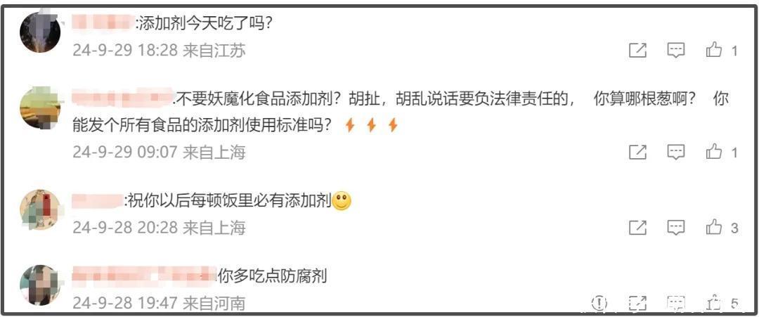 彼时,就有网友不满于他这番言论,到他社交账号的评论区留言,觉得他站着说话不腰疼,问他吃添加剂了吗?能发一个所有食品添加剂的使用标准吗?