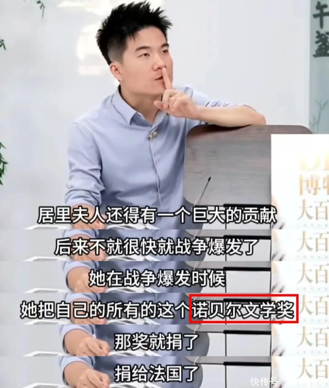 之后,董宇辉又介绍居里夫人的巨大贡献,那就是在战争爆发的时候把自己所有的诺贝尔文学奖都捐了,捐给了法国。这是他犯的第二个常识性错误,居里夫人两次获得诺贝尔奖,一次是物理学奖,一次是化学奖,她从未获得诺贝尔文学奖。